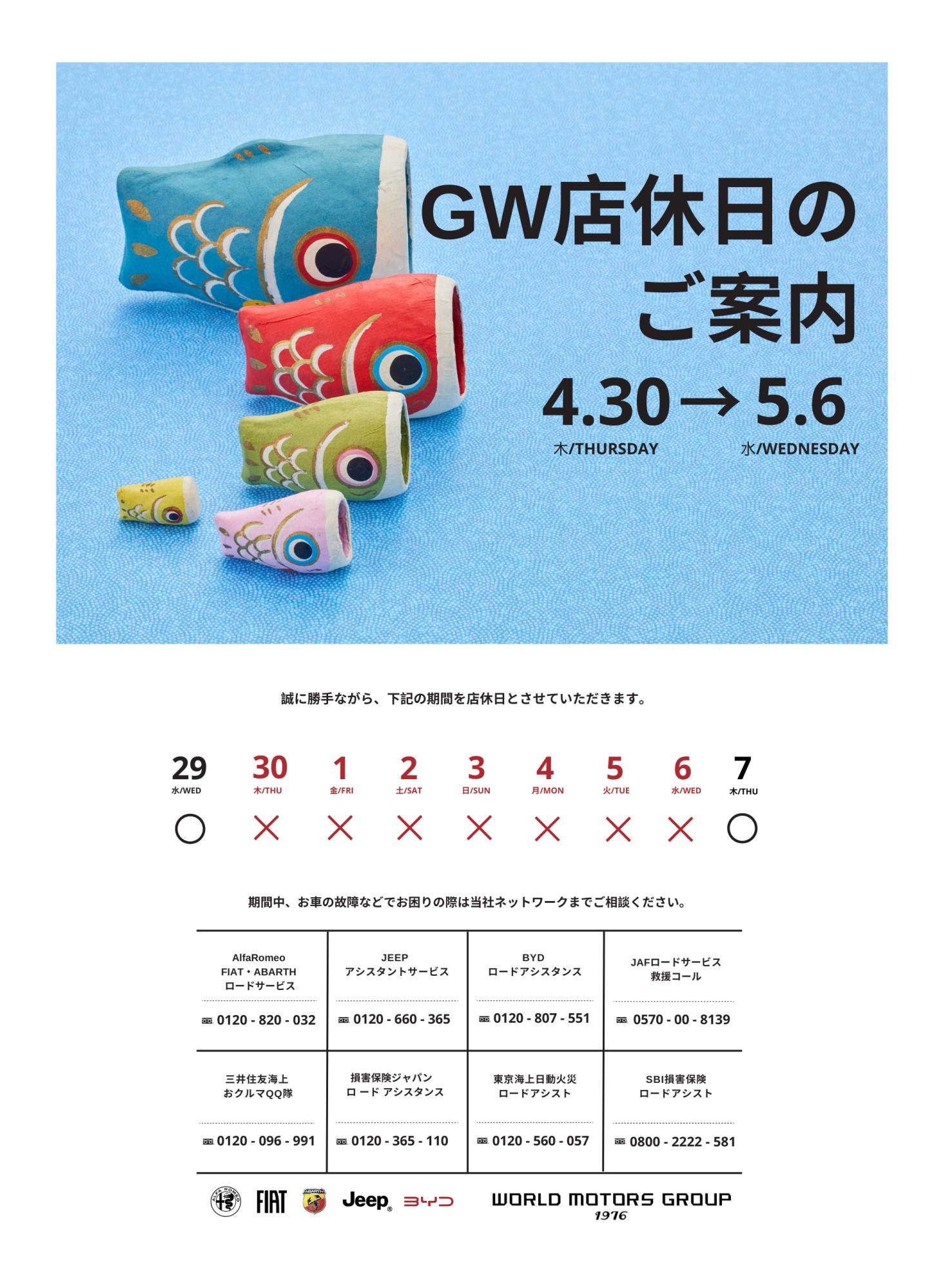 GW休業:4月28日(火)、4月30日(木)〜5月6日(水)